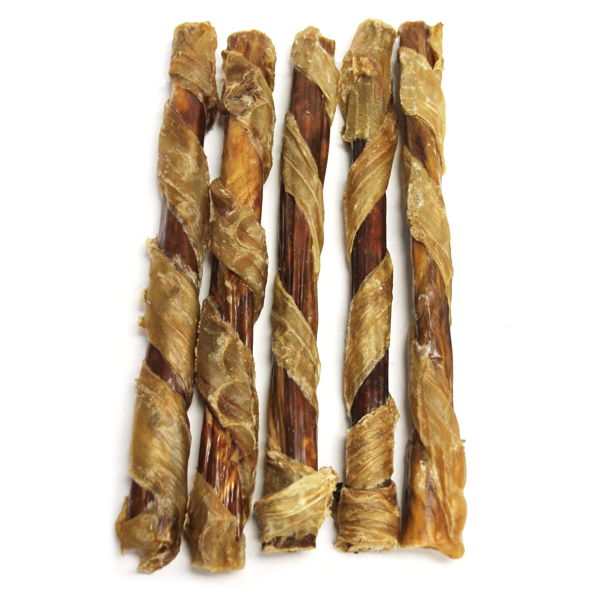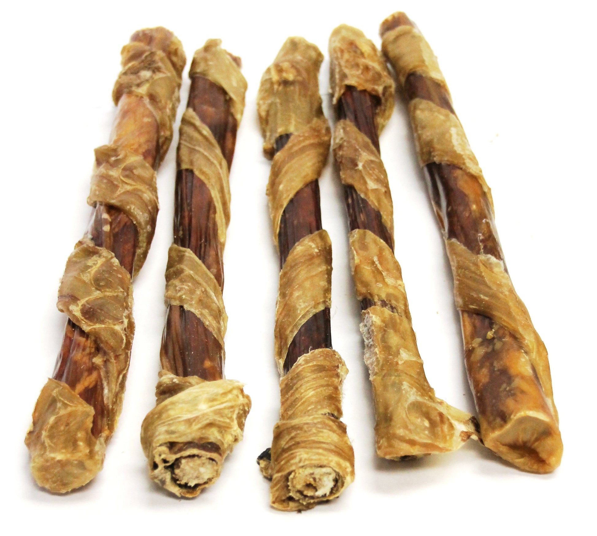 Description: This is a 12" beef esophagus (gullet) that has been stuffed with a ground beef filling, with a stretched beef bladder wrapped around. It looks kind of like a bully stick but it's a lighter chew.