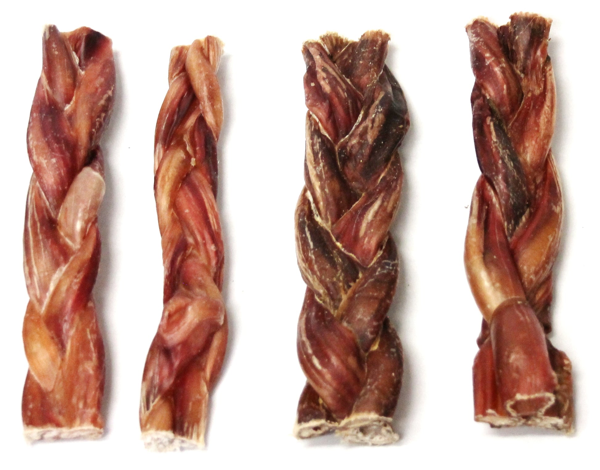 Description: A bull pizzle is split lengthwise, and these strips are braided together to create a braided bully stick. We hand-sort all of our bully sticks by weight, to ensure consistency. 6" thick braided bully sticks weigh 30g and above. There is a tough strip of beef intestine wrapped around the end of the braid which helps keep its shape.