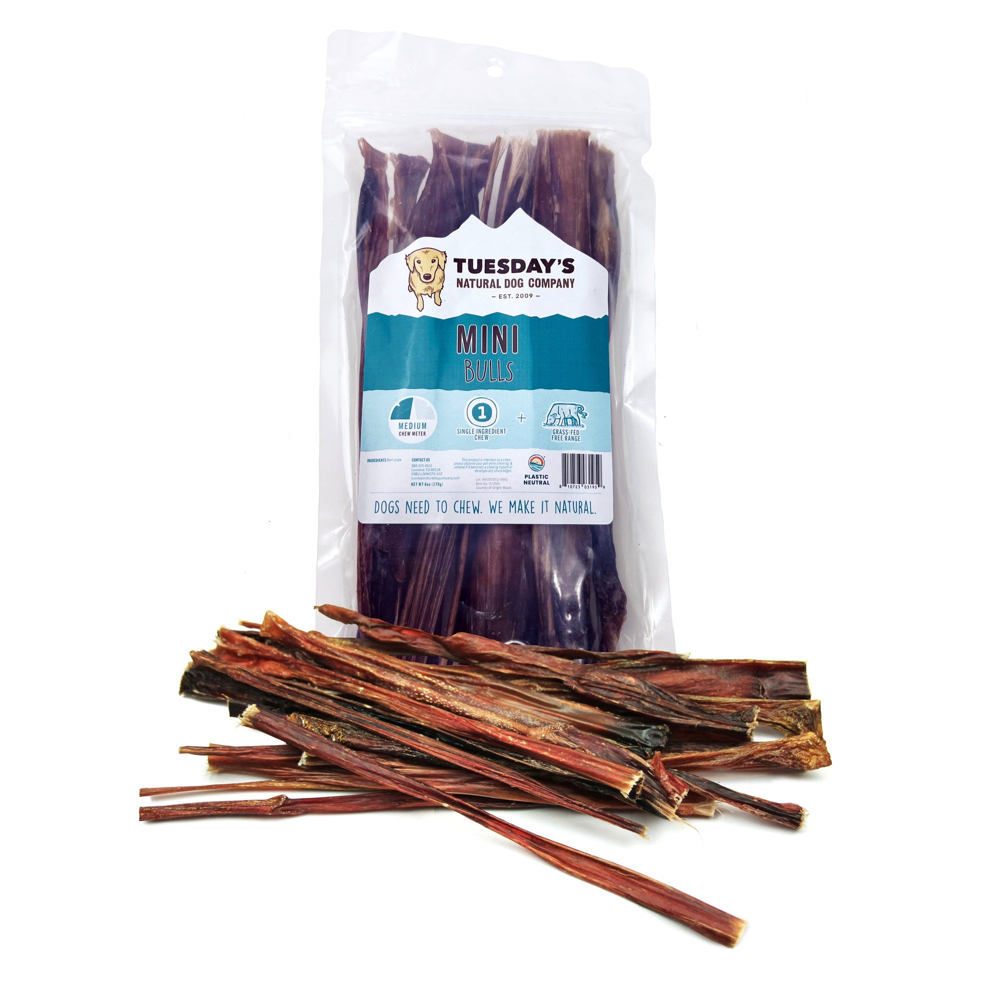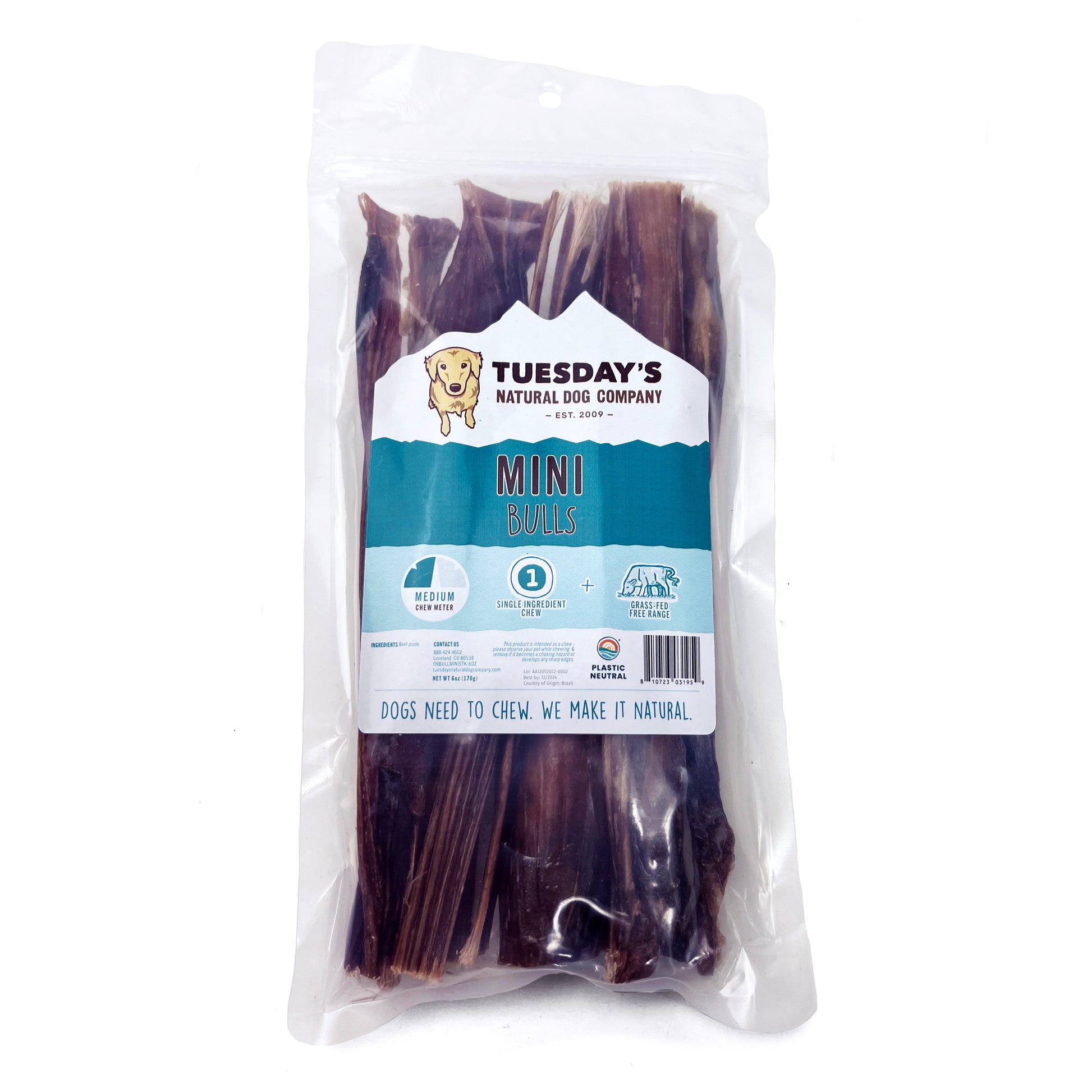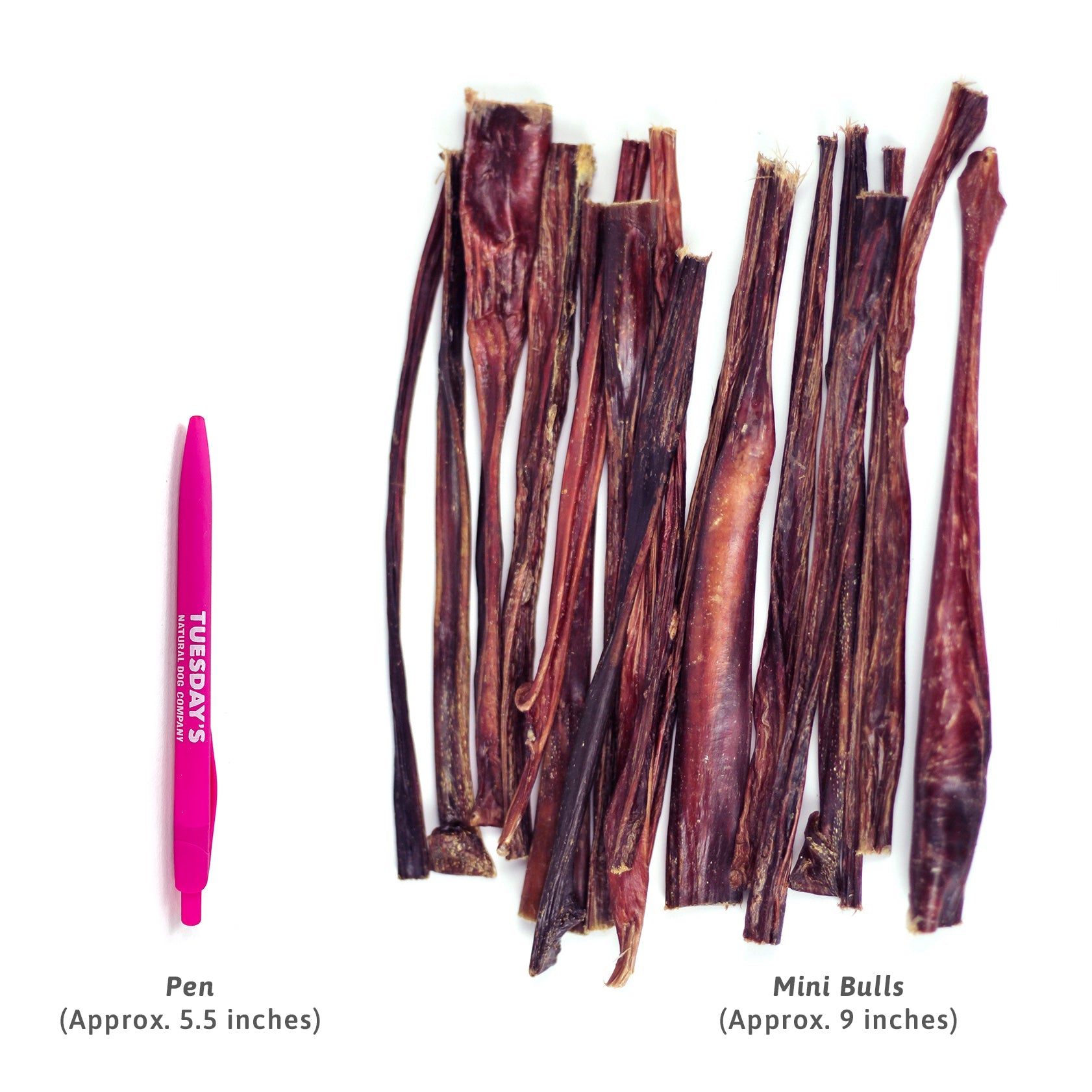 Description: These odor free Mini Bulls are made from the very tips of beef pizzle, so it’s a thinner and lighter chew compared to bully sticks made from the thick base of the pizzle. Each piece is about 9" long, and there is some variation in thickness.