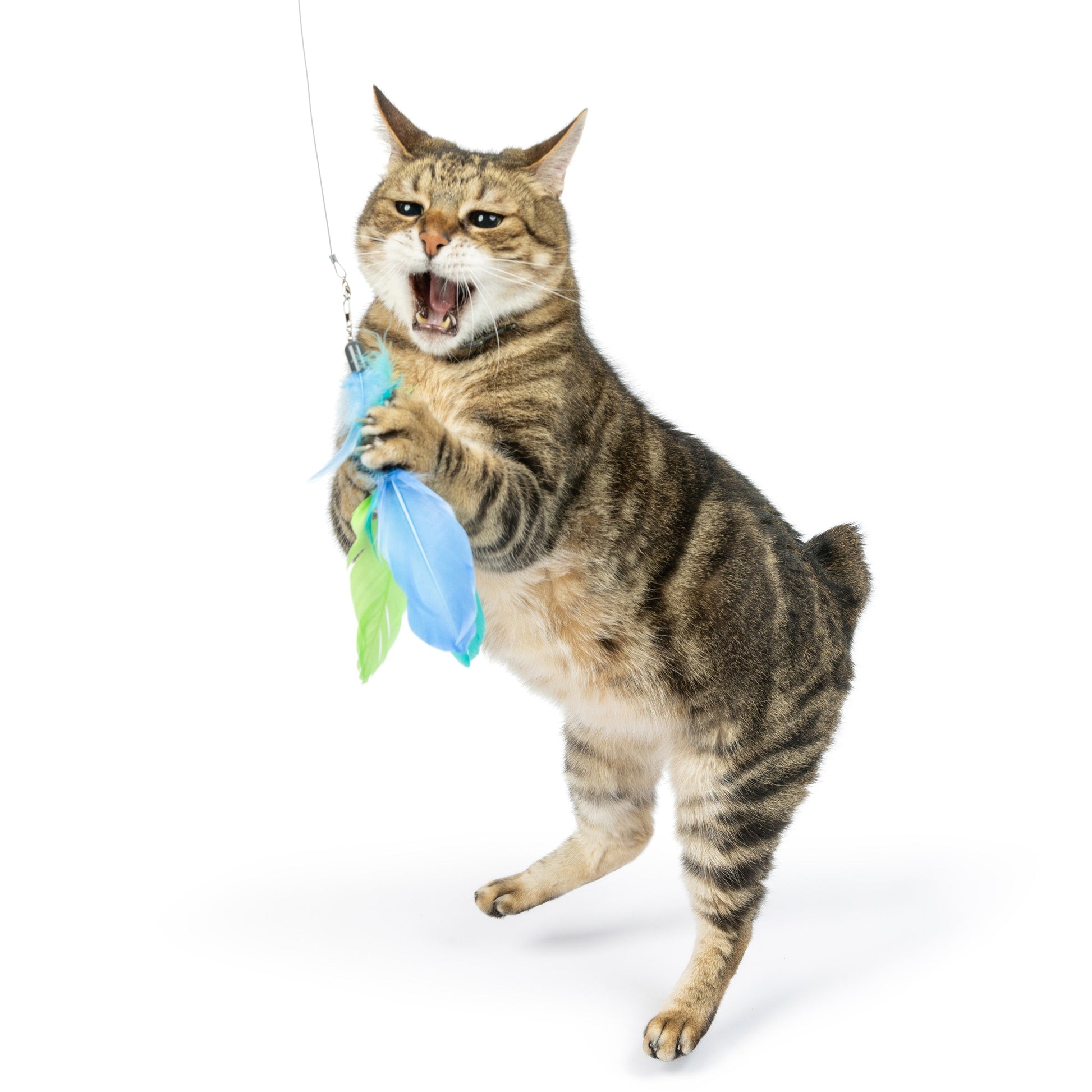 After playtime, store wands and teasers out of reach to prevent kitty from chewing on wires, streams, and small metal parts.