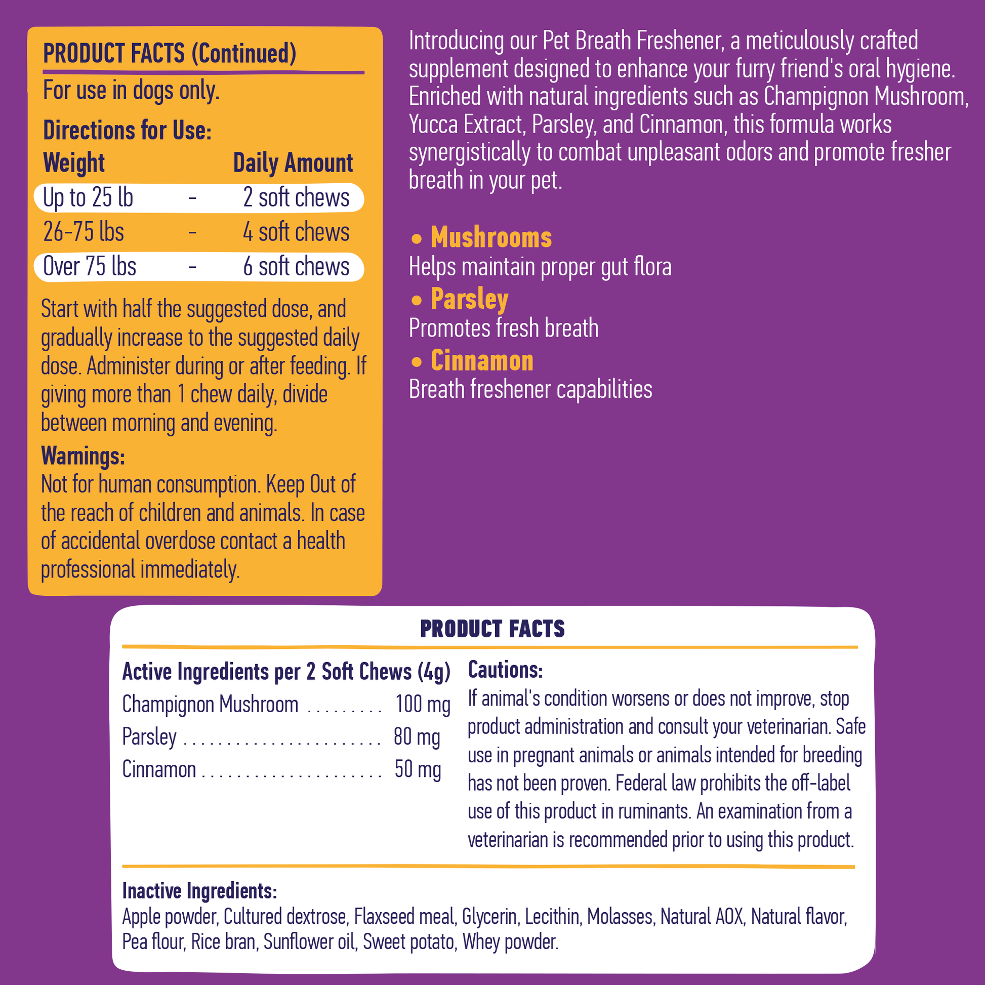 Only Nature’s Best: These breath aid pet chews are made in the USA using the finest quality, carefully selected ingredients, containing no preservatives, fillers, artificial flavors, or colors. Our supplements are free from grain, cellulose, or palm oil!