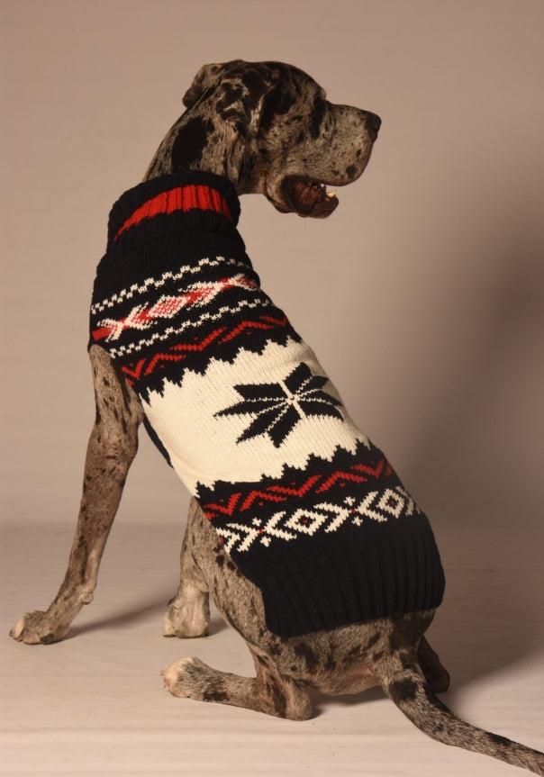 The Navy Vail Wool Dog Sweater is crafted from 100% sheep wool.