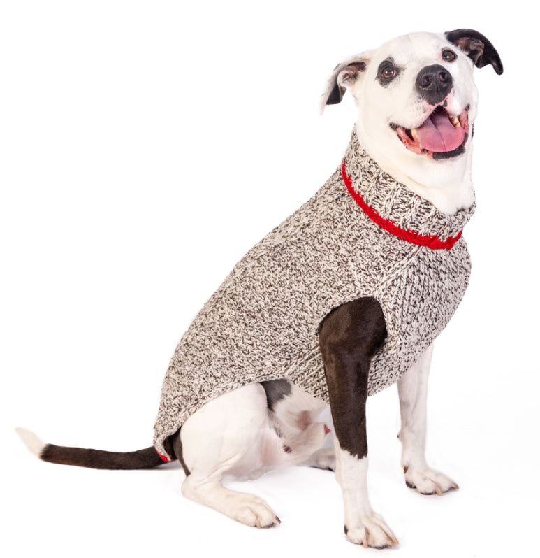 The Oatmeal Cable Knit dog sweater design was inspired from the beautiful colors of oatmeal and red trim.