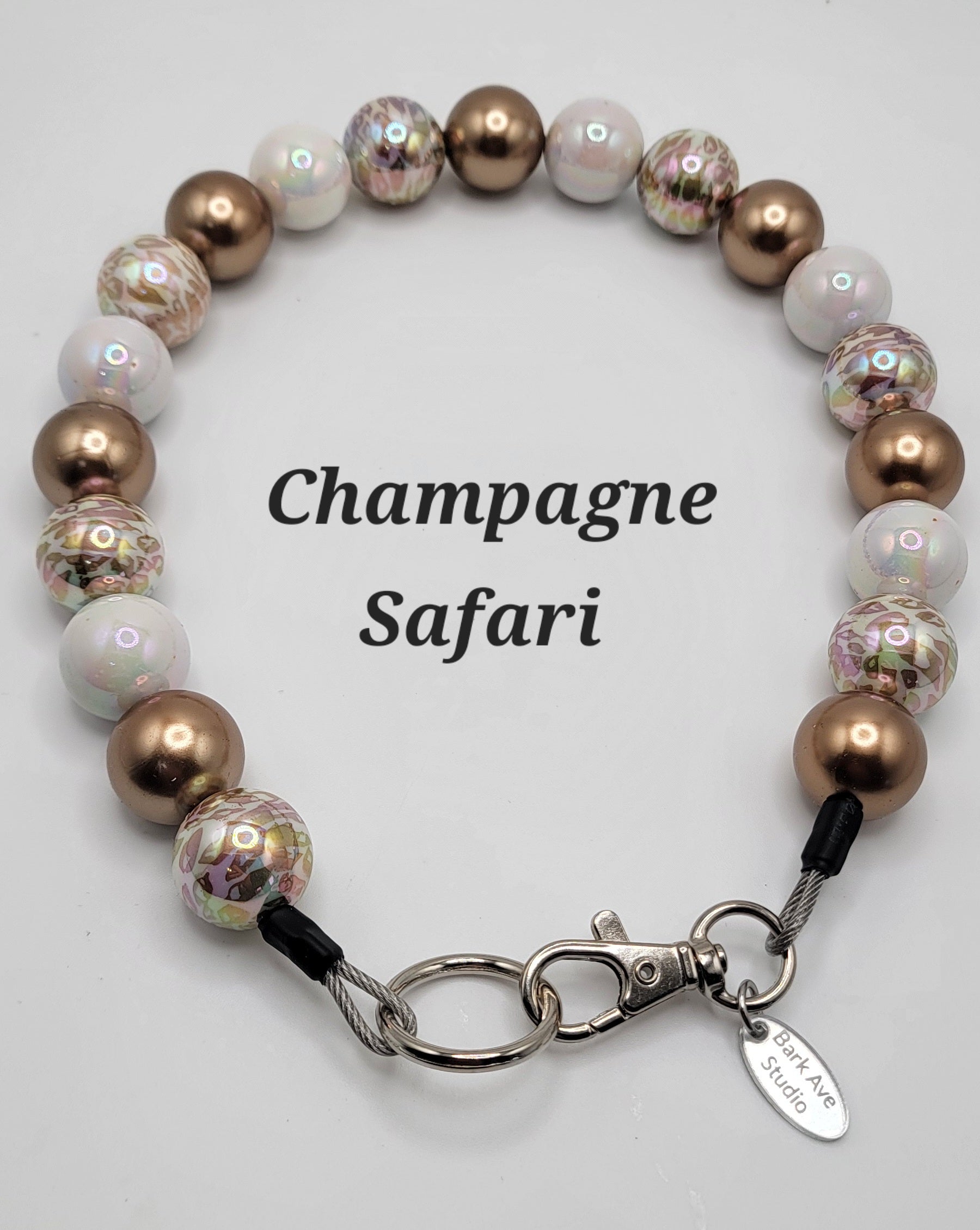 Stunning Champagne, Pearl, and Safari Print beads bring fashion and class to any pup!