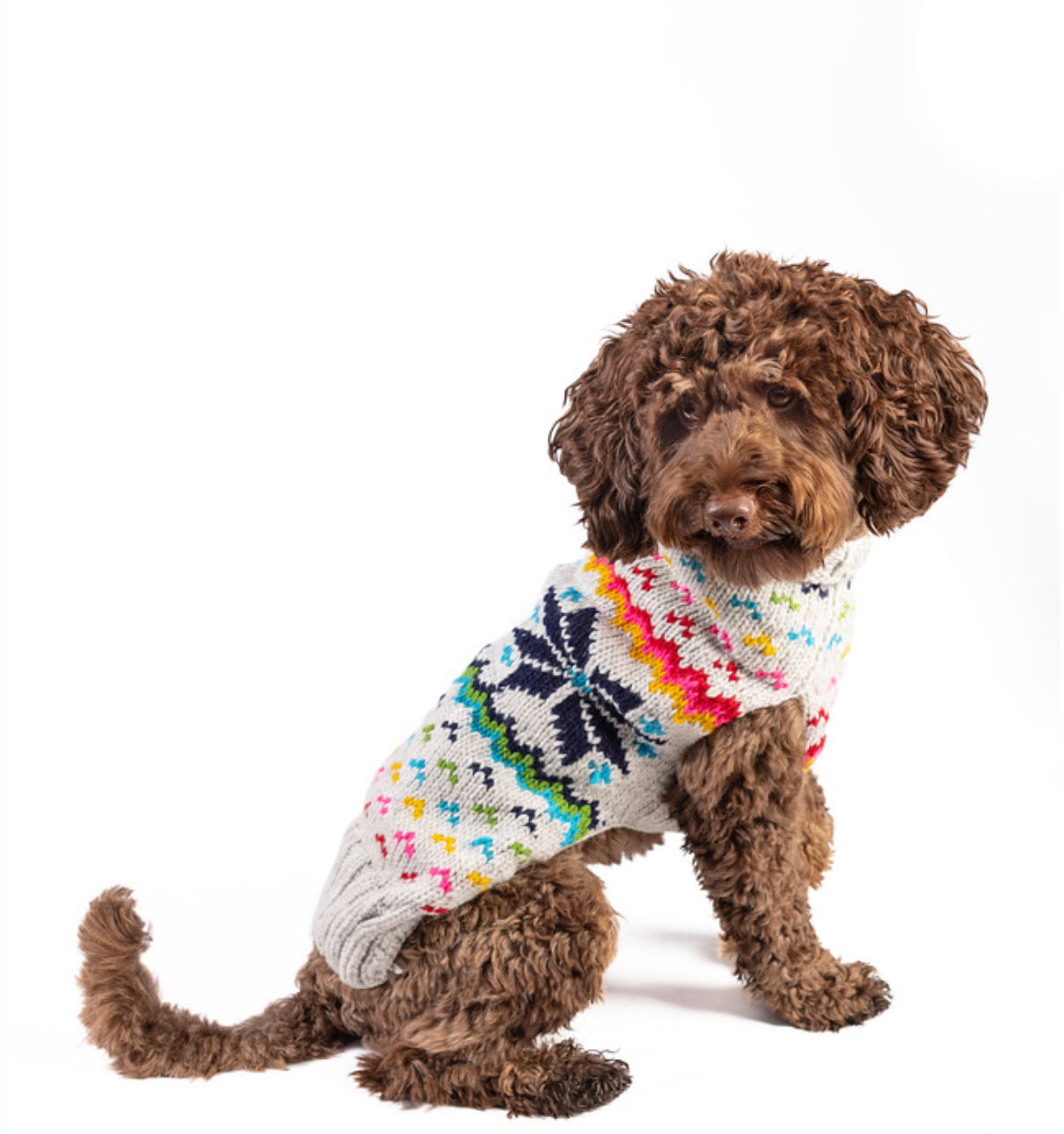 The Rainbow Snowflake sweater is fun, warm and perfectly crafted to fit even barrel chested breeds.