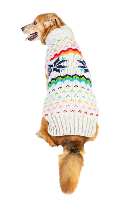 The Rainbow Snowflake Dog Sweater design was inspired from the colors of the rainbow. Get through a grey dreary winter with your pup wearing the bright rainbow snowflake sweater.