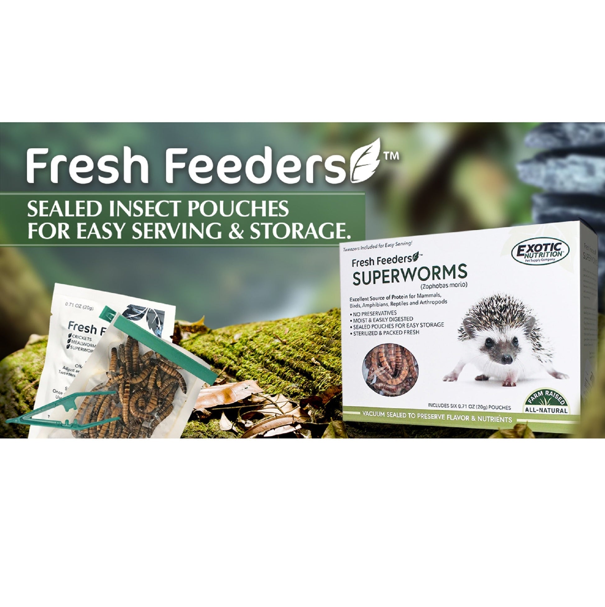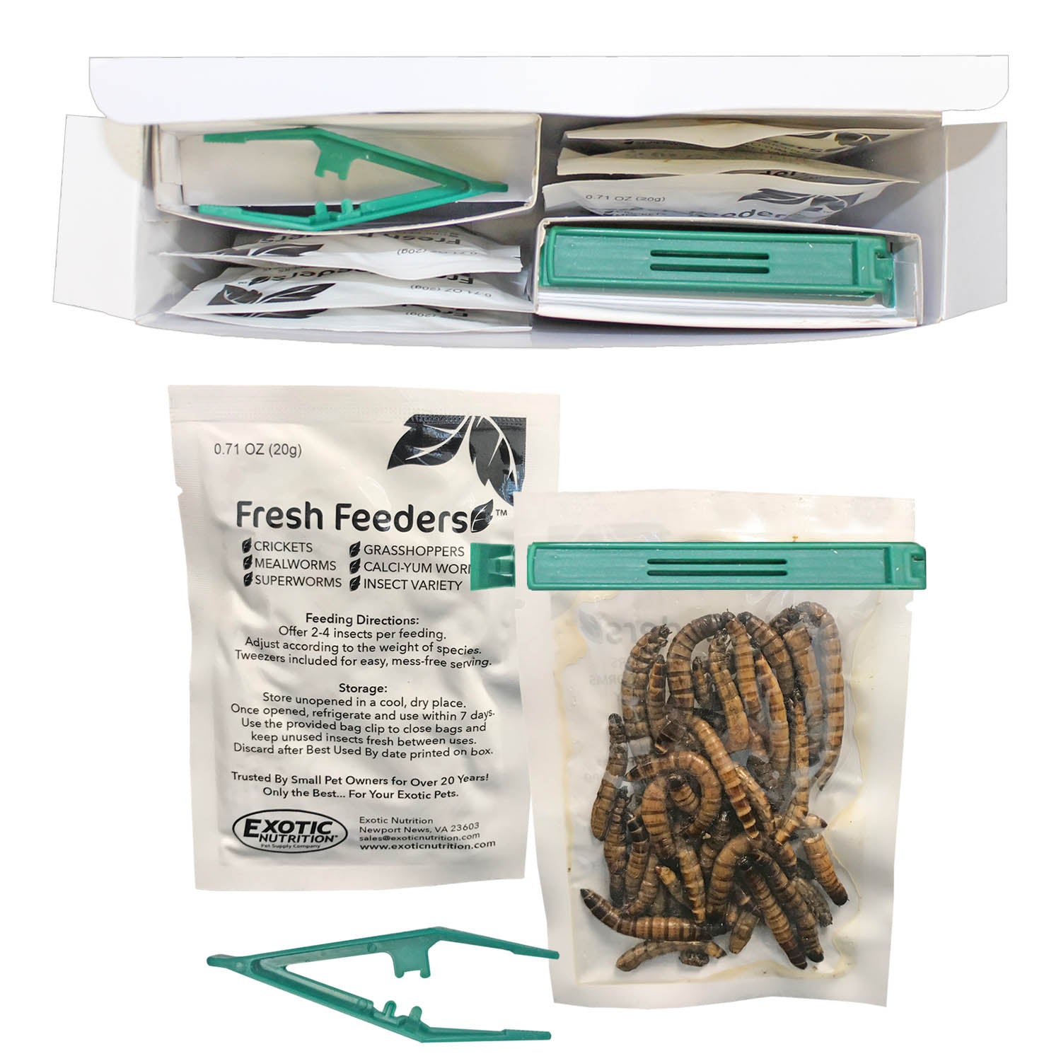 Exotic Nutrition's Fresh Feeders provide freshly packaged moist insects that are sterilized (cooked) then packaged in convenient pouches for your easy feeding. Farm-raised, all-natural insects contain no preservatives and are easily digested. Each box contains six individual pouches that can be re-sealed (bag clip included) for easy storage. Ideal supplemental food source for Sugar Gliders, Hedgehogs, Squirrels, Turtles, Tropical fish, Reptiles, and Amphibians. Comes with feeding tweezer too!