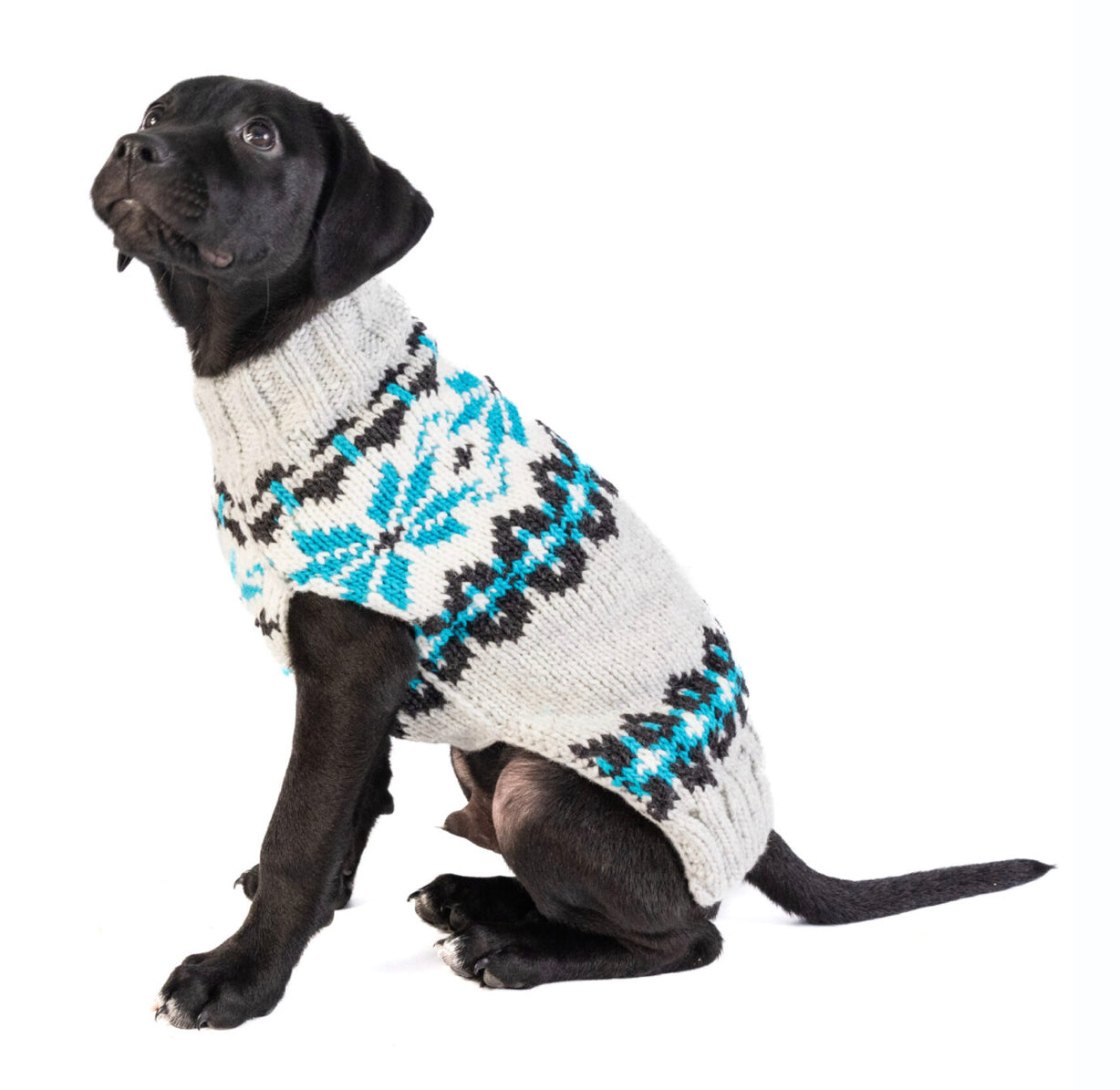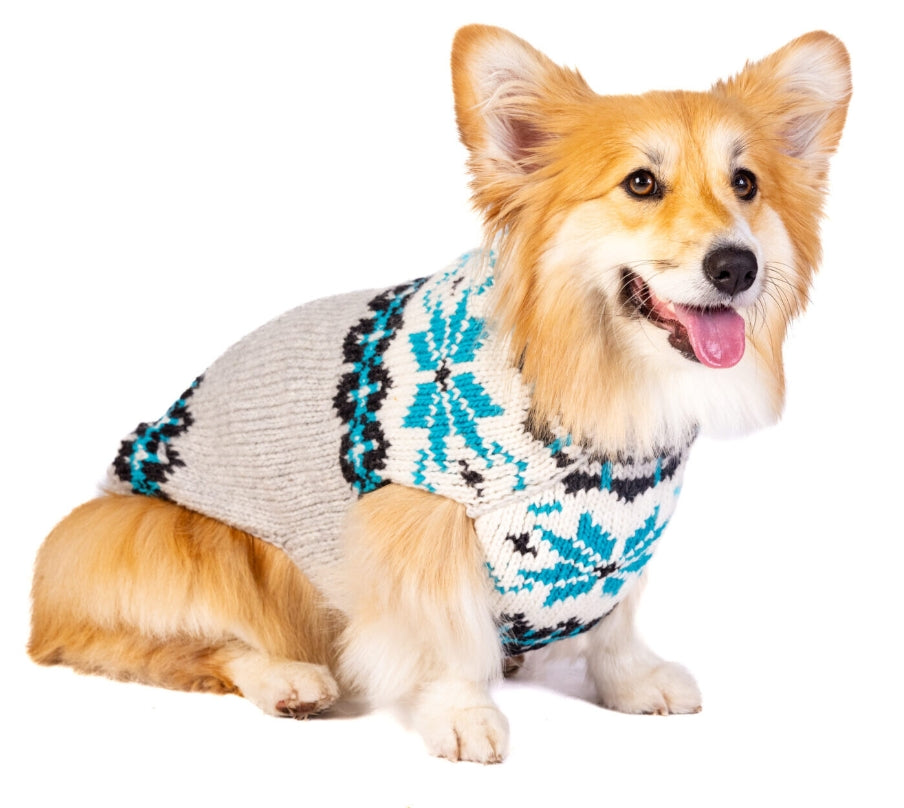 The Chilly Dog Frost Dog Sweater is hand knit made from 100% wool.