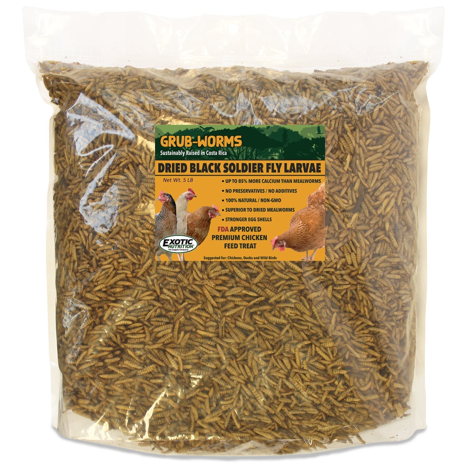 Exotic Nutrition Grub-Worms are a premium supplemental chicken food that is nutrient dense and packed with healthy fats. These dried larvae were raised in a rural Costa Rican rainforest environment (where this species is native) and fed pesticide-free, non-GMO organic feeds. Provide your hens a healthier (protein & calcium packed) treat with Exotic Nutrition Grub-Worms. Sustainably produced, all natural golden color 100% Costa Rican dried Black Soldier Fly Larvae. This insect treat has up to 85x more calcium than dried mealworms. Used in conjunction with a balanced feed, provide your birds the grub they'll love. Great for Ducks, Chickens, Wild birds and other birds.