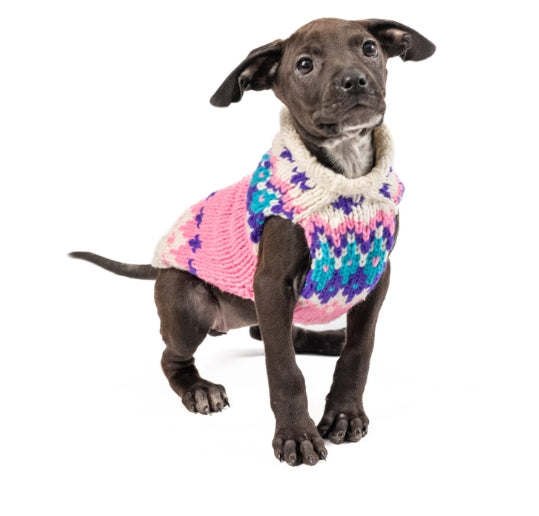Our Pink Ski Bum dog sweater includes beautiful bright blues and vibrant pinks. This trendy sweater features a leash hole on the back area. This looks great on both male and female dogs and are available in 8 sizes to fit every dog breed. They’re easy-to-use daily because of its unique pullover dog sweater design.