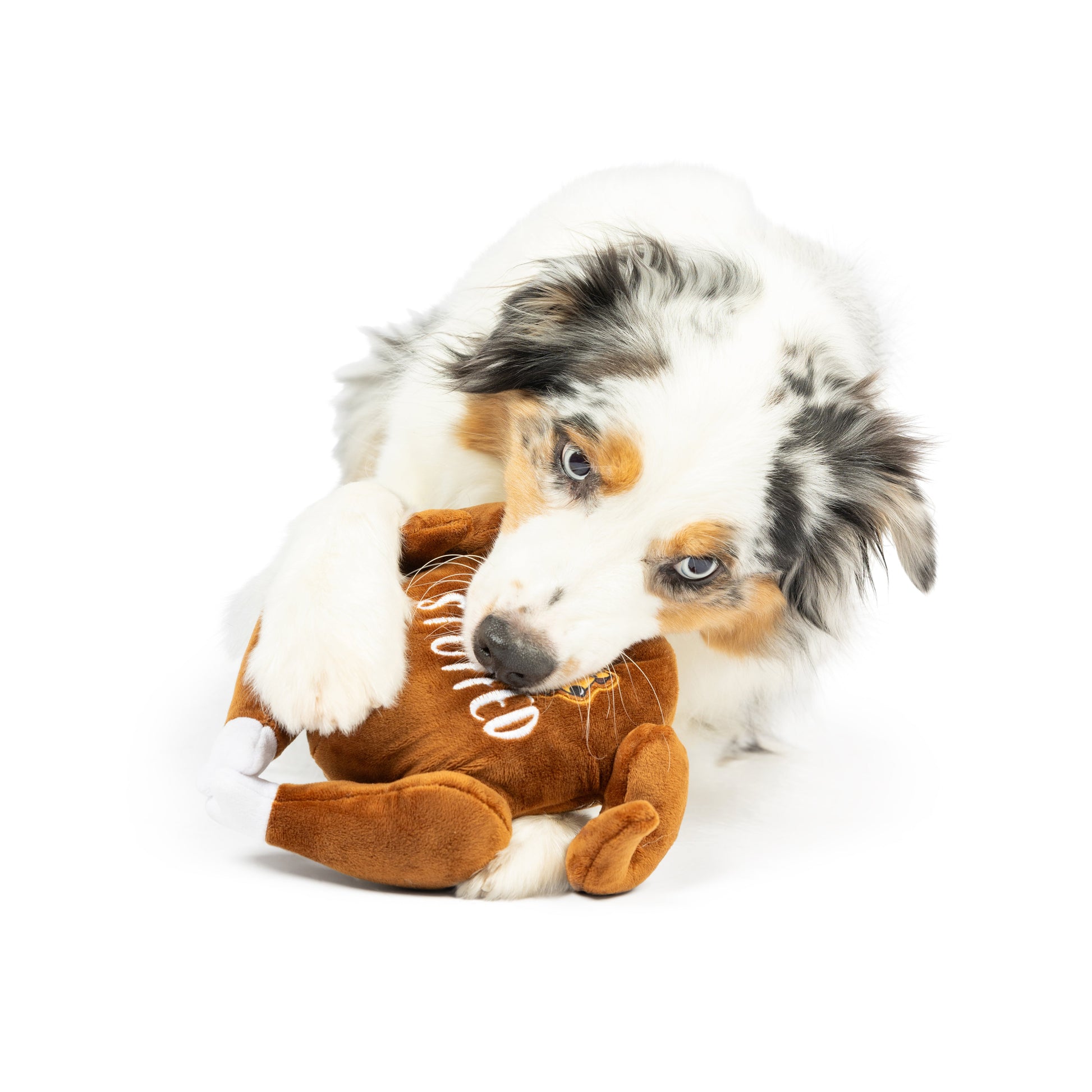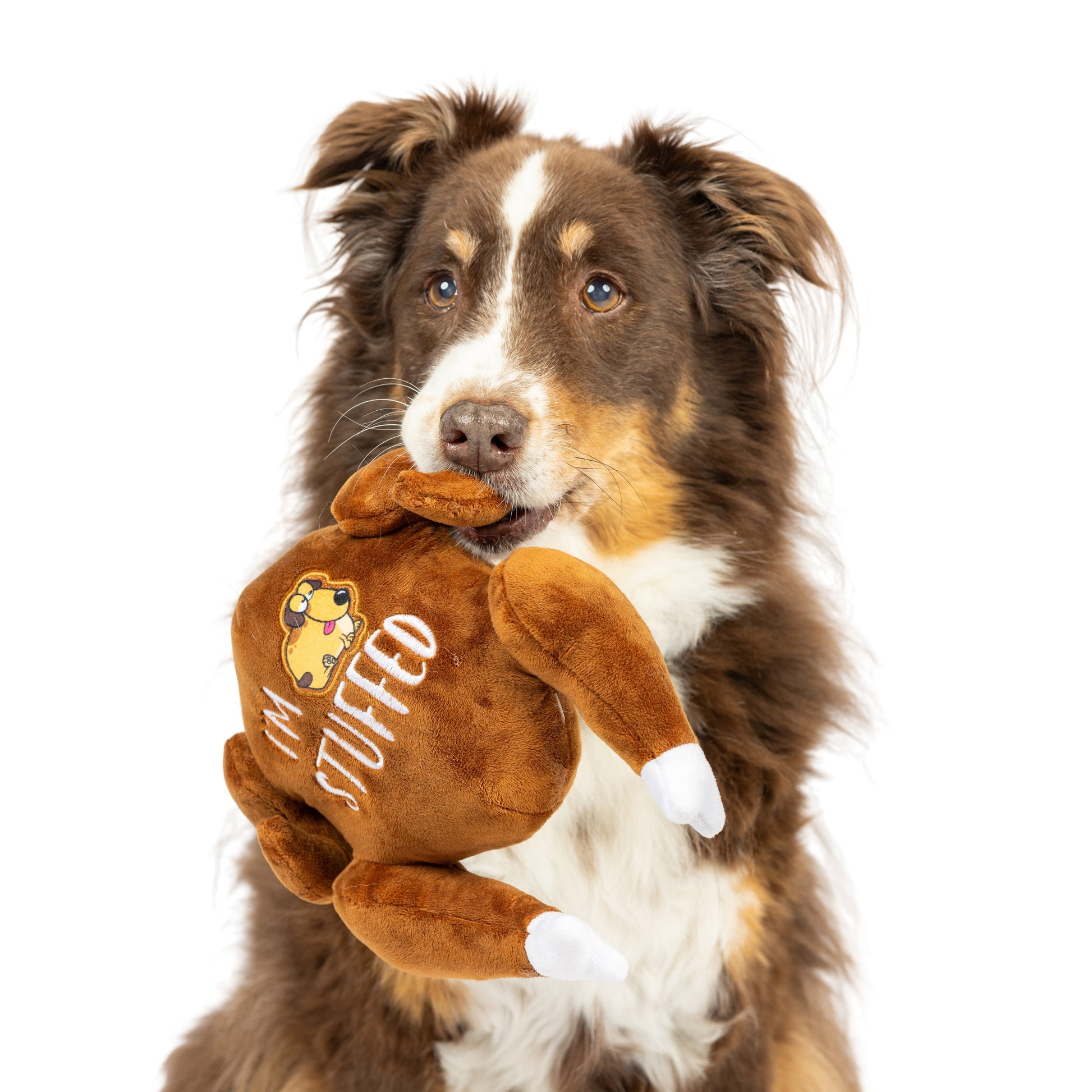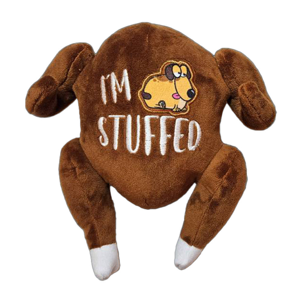 Get ready to gobble up the fun with our I'm Stuffed Turkey dog toy! Featuring an embroidered 'I'm Stuffed' message and an adorable pup who may have indulged a bit too much, this toy is sure to bring laughter to the holidays.