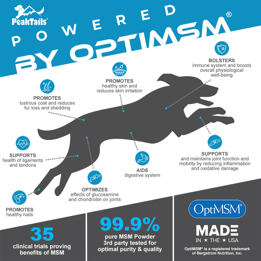 PeakTails MSM Powder is a fast-acting veterinary-formulated supplement for dogs that supports joints, minimizes stiffness, and reduces discomfort associated with daily exercise.