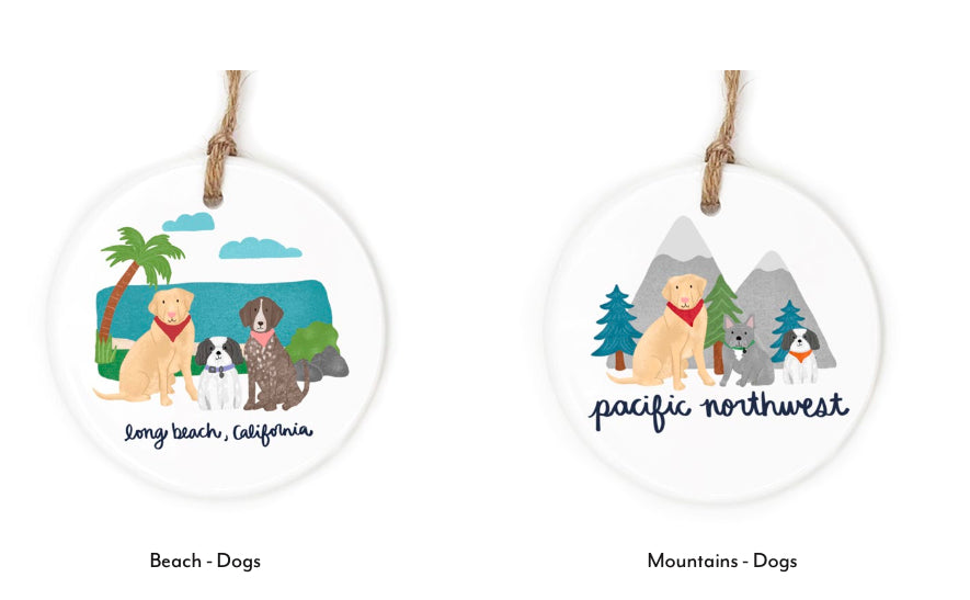We love partnering with our shops and can work with you to customize one of our designs by adding your city, region, shop name, or phrase to an ornament or sticker. When you place order just note which design you’d like (Seattle, Portland, Golden Gate, Mountains, Ferry or Beach), if you’d like cats or dogs, and the wording you’d like. *Note: You can combine up to four different designs to meet the sticker minimums.
