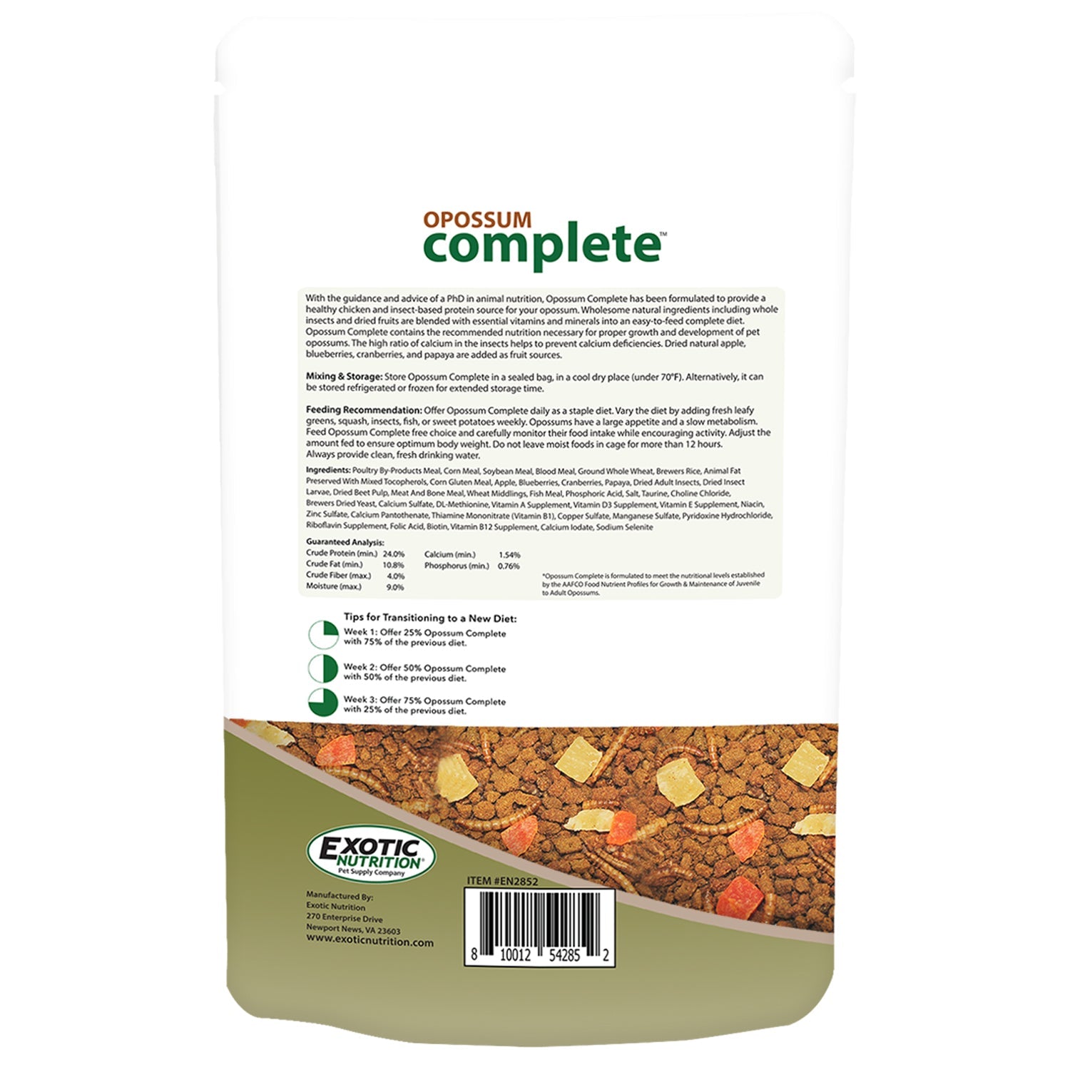 With the guidance and advice of a PhD in animal nutrition, Opossum Complete has been formulated to provide a healthy chicken and insect-based protein source for your opossum. The high ratio of calcium in the insects (BSFL) helps to prevent calcium deficiencies. Dried natural apple, blueberries, cranberries, and papaya are added as fruit sources. See below for full product ingredients and analysis.