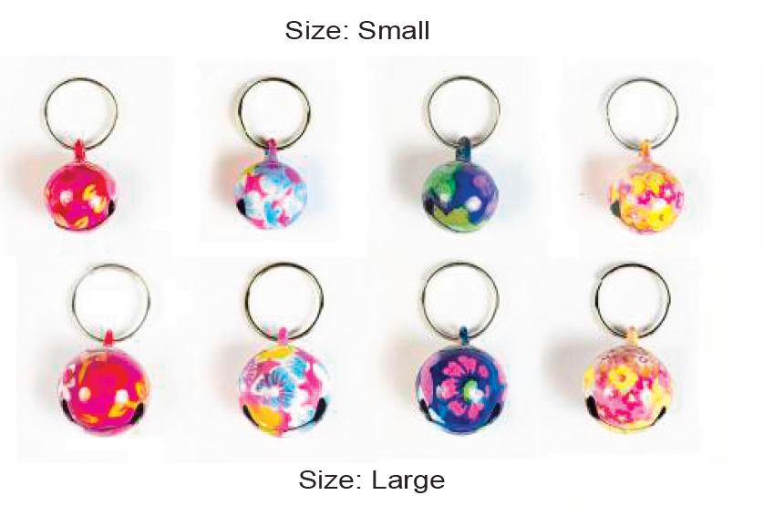Peachy-Daisy Bells are available in 2 sizes and 4 luminous colors. See picture above. ISO: consist of an assortment of 16 large bells and 16 small bells. Total: 32 pieces. One free hanging bell display with ISO purchase.
