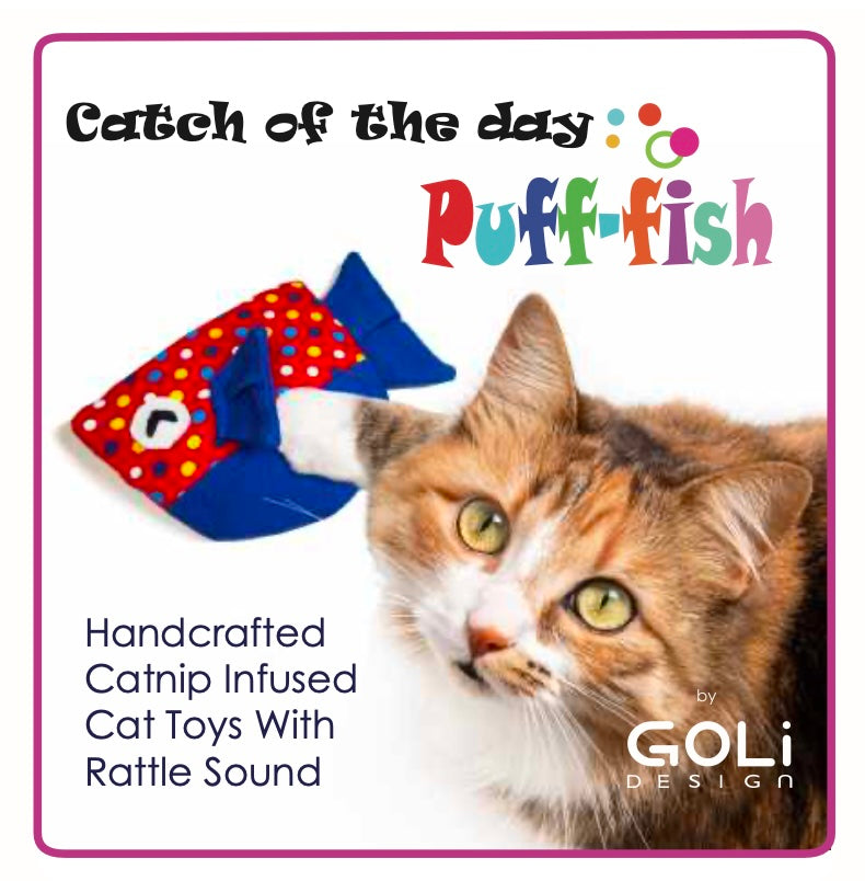 Hand-crafted, these beautiful Puff-fish are infused with catnip oil (derived from