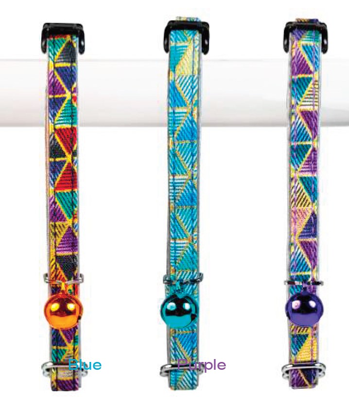 Pyramid reflective cat collars are available in 3 beautiful printed fabrics. The base colors of the webbing are: Bronze, Blue, and Purple.