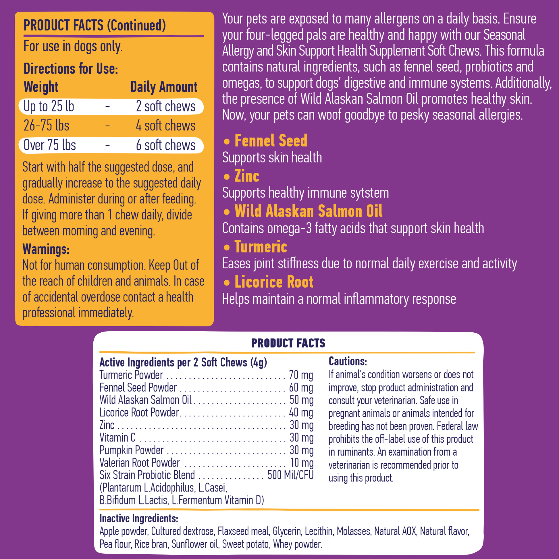 Your pets are exposed to many allergens on a daily basis. Ensure your four-legged pals are healthy and happy with our Seasonal Allergy and Skin Support Health Supplement Soft Chews. This formula contains natural ingredients, such as fennel seed, probiotics and omegas, to support dogs’ digestive and immune systems. Additionally, the presence of Wild Alaskan Salmon Oil promotes healthy skin. Now, your pets can woof goodbye to pesky seasonal allergies.
