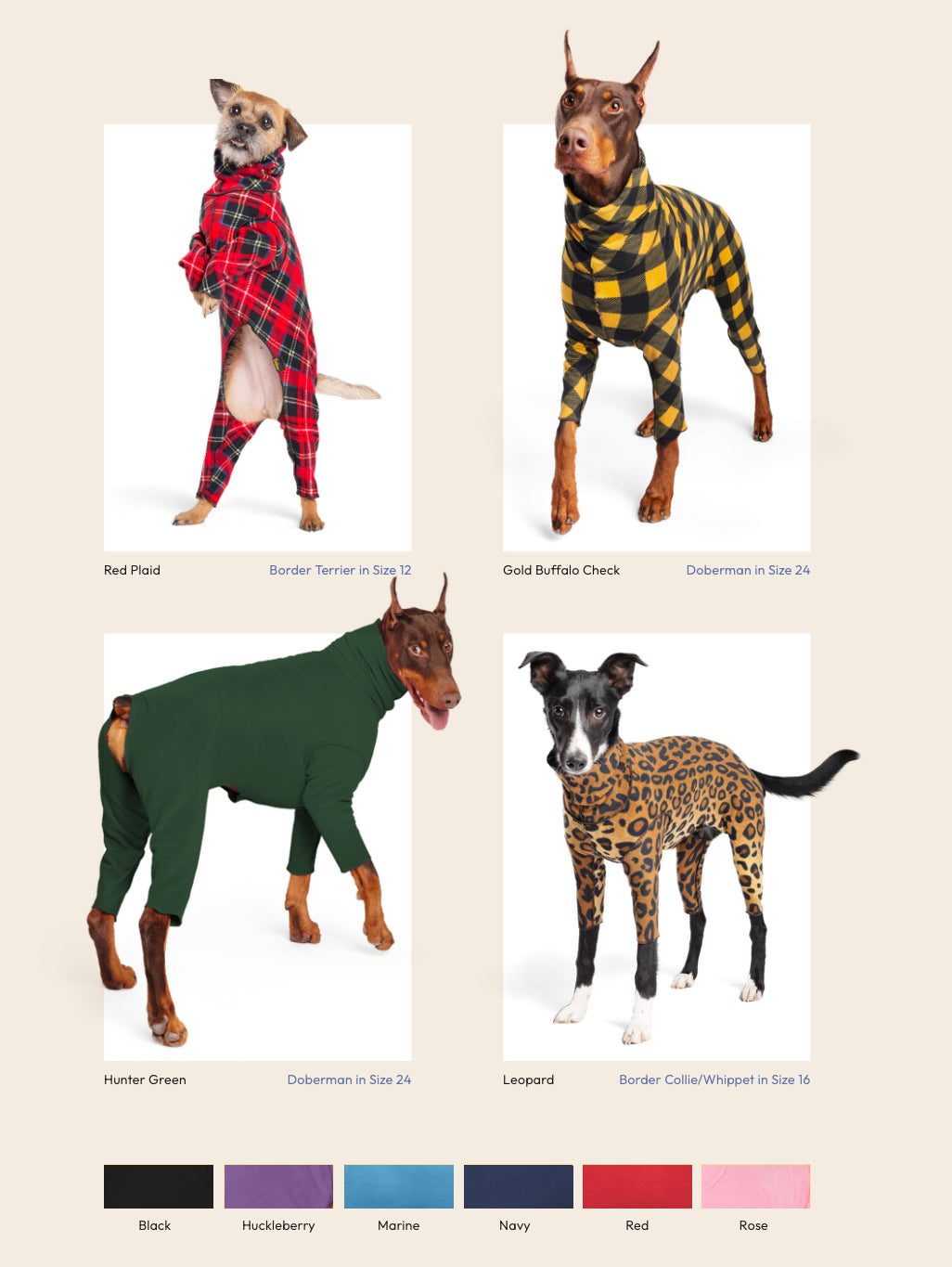 Fitting: This style fits true to our Stretch Fleece sizing - so if you know your pup's size in that style, you'll be all set for this style too. Let's talk sleeve length- while a Corgi or a Doxie might not have the legs of a whippet, we can onesie your shorter-statured friend too! Drop us an email after you order and we can shorten those sleeves, no problem!
