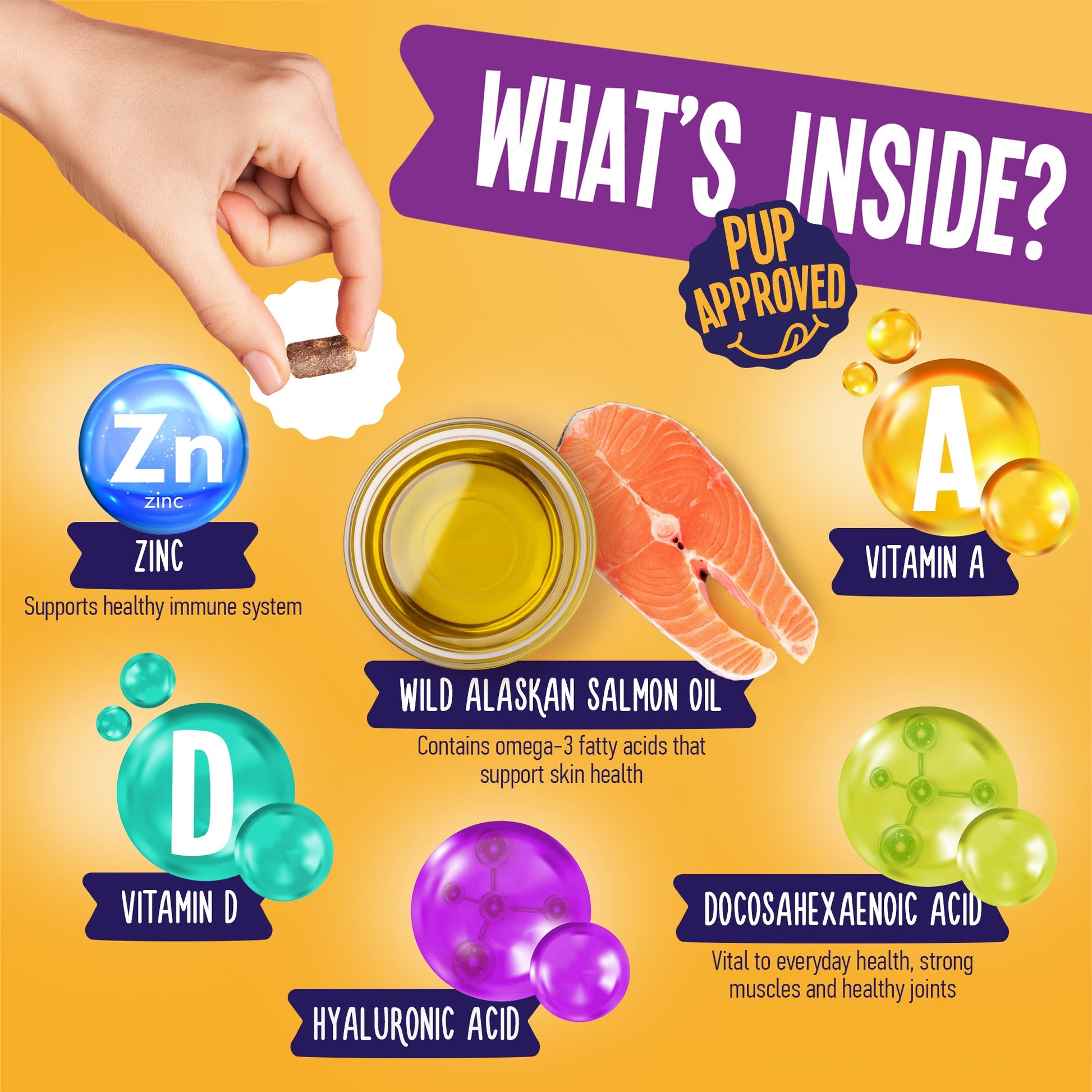 Safe Ingredients: This skin and coat support for dogs has a nutritious formula packed with vitamins, minerals and fatty acids but free of preservatives, artificial flavors, cellulose, palm oil, or grain.