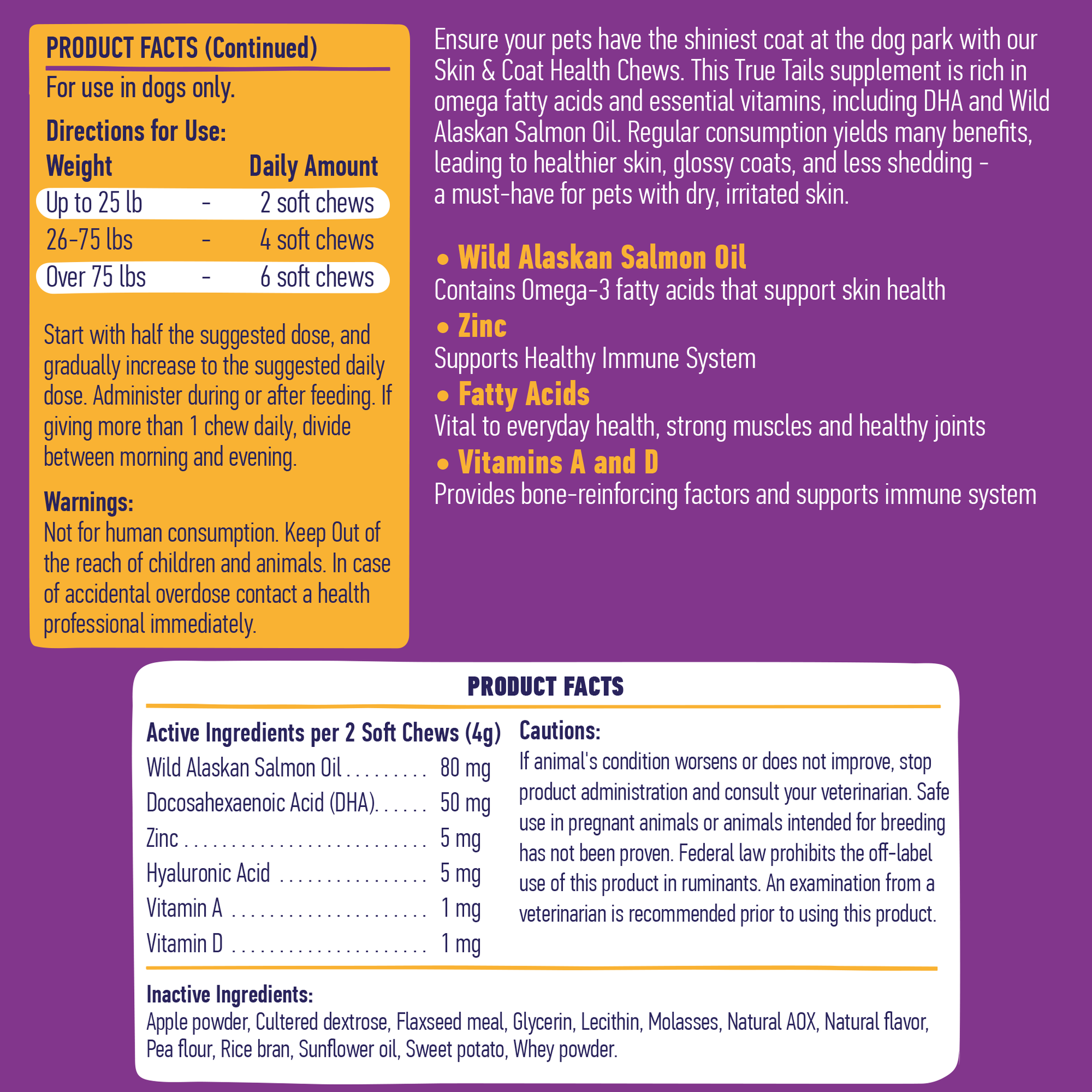 A Must for Your Best Friend: Do you want to make sure your best friend receives only what’s best in terms of healthy chews? The True Tails Skin and Coat supplement for dogs is excellent aid for your pet’s skin health, coat and immune system!