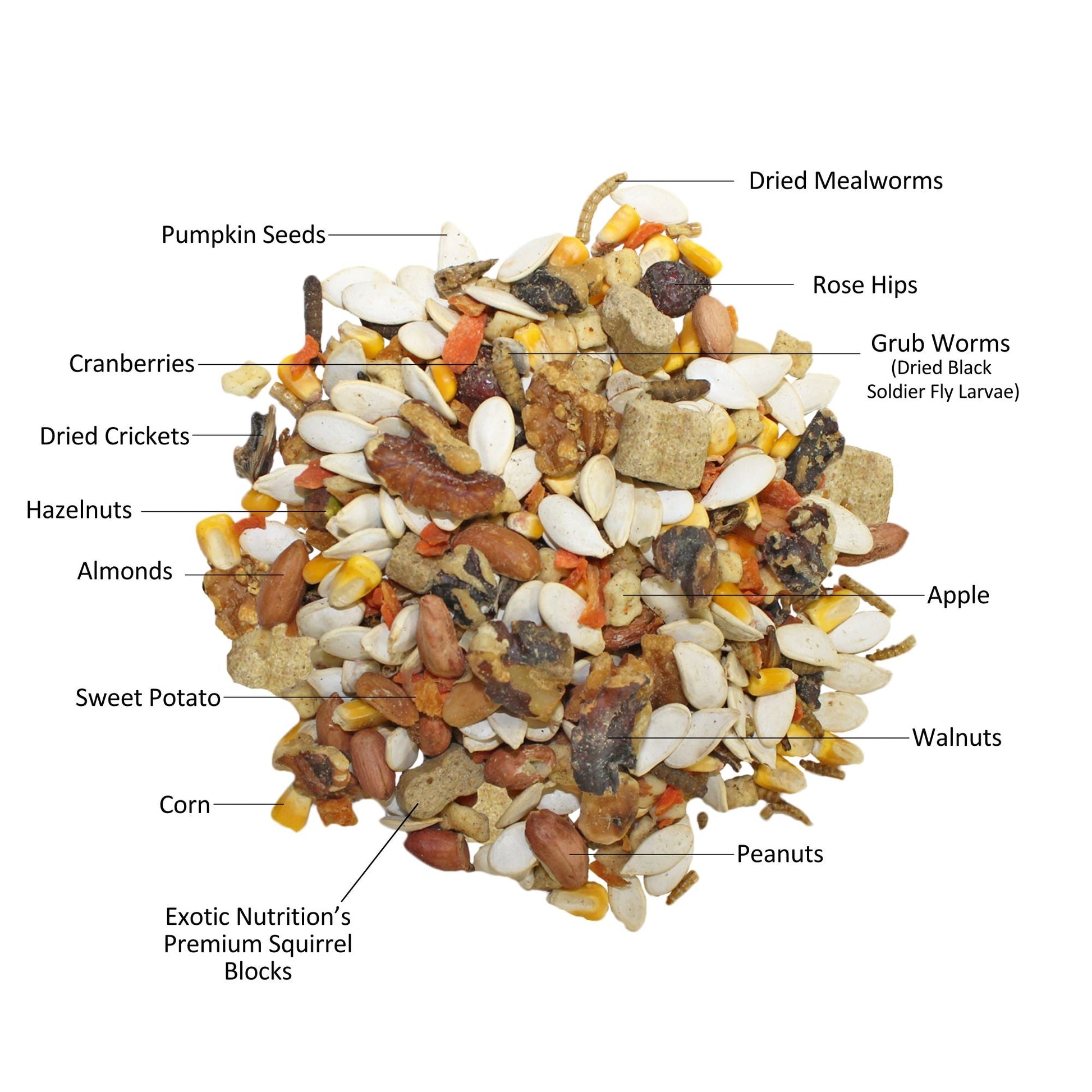 Exotic Nutrition's Squirrel Complete is an all-natural diet made with tree nuts, vegetables, berries, seeds, and squirrel blocks for added nutrition and dental health. Provide your pet with complete nutrition without compromising taste. This diet includes premium ingredients such as walnuts, hazelnuts, almonds, and pumpkin seeds that your critter with love! Suggested for: Ground Squirrels, Grey Squirrels, Flying Squirrels, and Chipmunks.