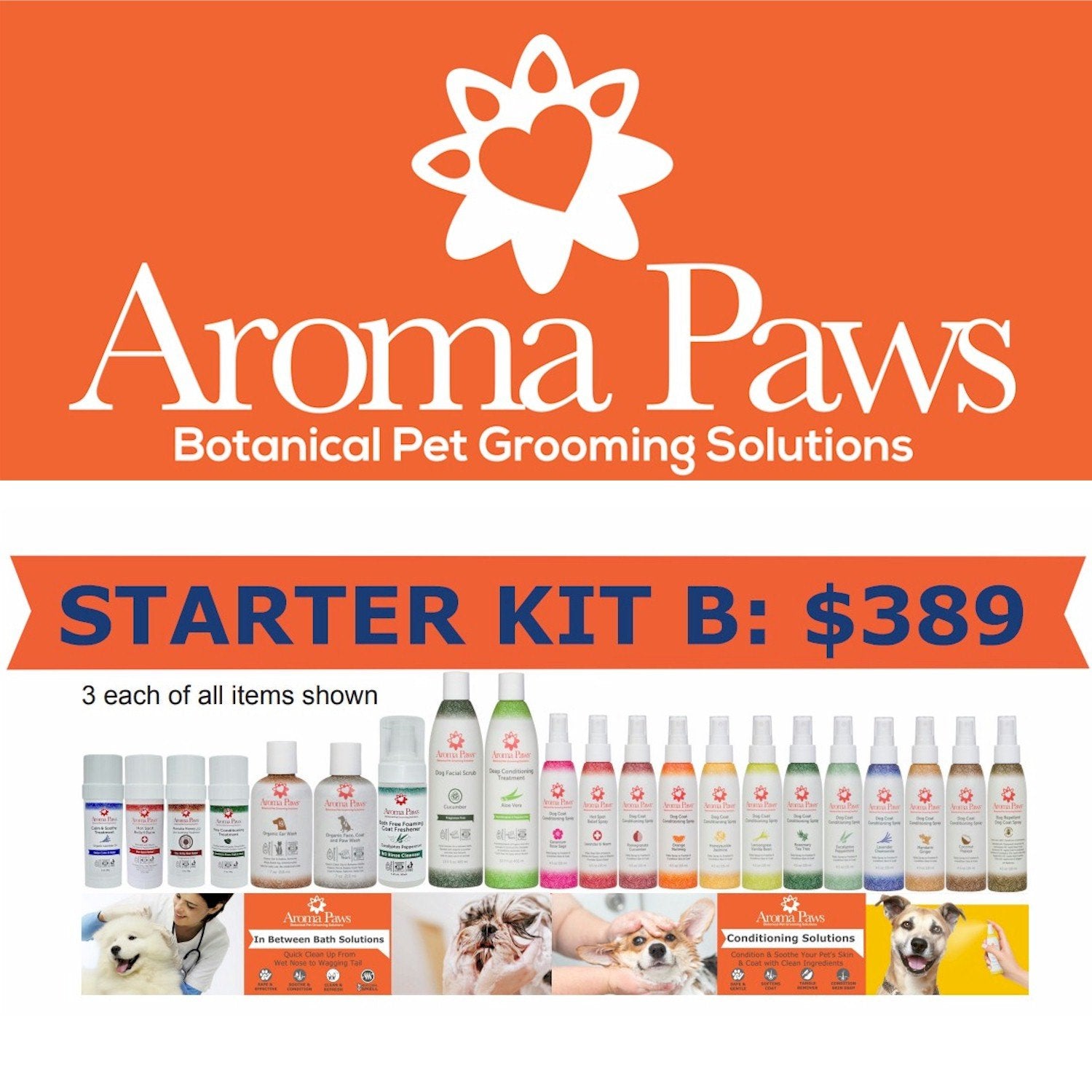Get started with Aroma Paws' 2024 Starter Kit B, a fantastic choice for groomers and retail stores. This kit includes three of each item displayed, along with marketing materials to boost your business. Aroma Paws was born from a desire to create healthy, beautifully fragranced grooming solutions for our furry friends.