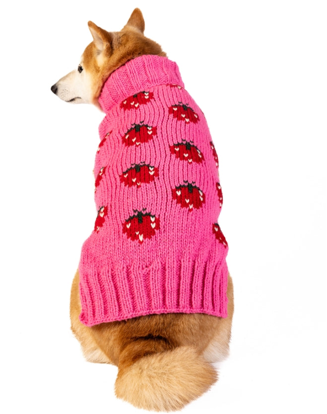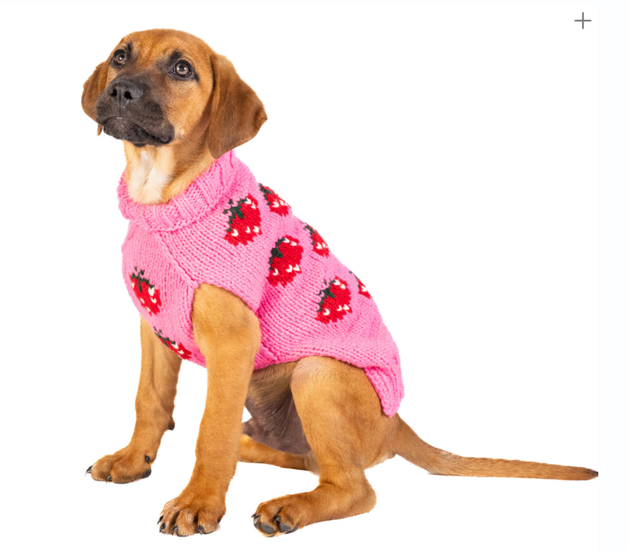 Our Strawberry Dog Sweater is available in 8 sizes to fit every dog breed.