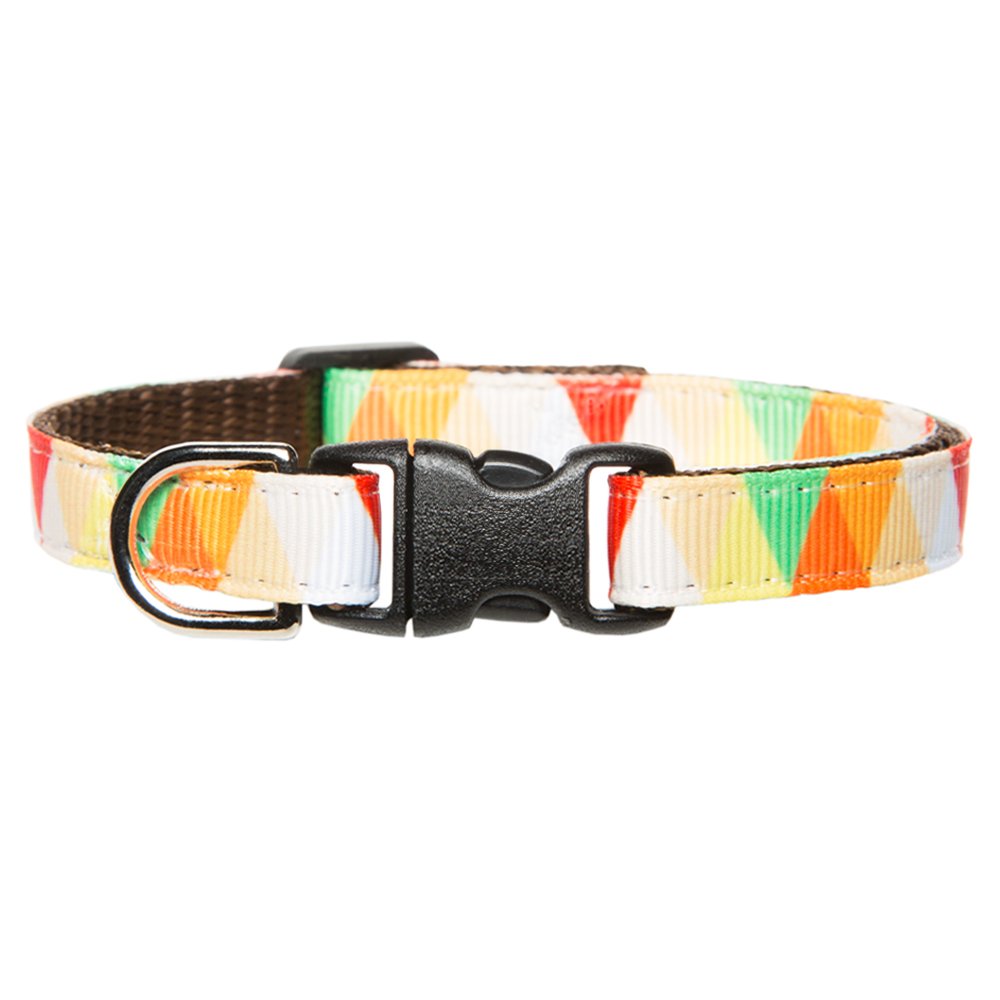 The Raise + Shine cat collar features a festive orange triangle print. This bright look is the perfect final touch for the kitty who always ready to conquer the day. All collars feature breakaway buckles for your cat's safety. Not to be used with a leash. Sizing: Kitten fits necks 5-8" Standard fits necks 7-10" Lion fits necks 9-12" A bell can also be added for an additional $0.50. All of our items are handcrafted with love in Portland, Oregon. All collars are made of high quality webbing for durability, covered with hand selected ribbon. We use high end D-rings and durable hardware that secures easily into place. We also double stitch stress points; making our collars both sturdy and gorgeous. Note that each collar is custom made and fabric pattern may vary. MSRP: $12.99 - $13.50