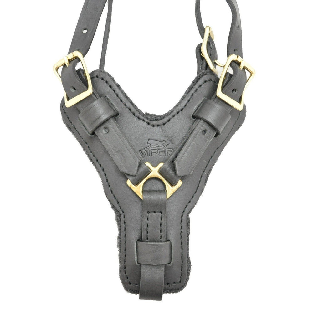 The Typhoon harness is handcrafted in Europe of genuine full grain leather and features a solid forged brass metal hardware, welded D ring, and felt padded breastplate. Leather-wrapped handle helps to gain immediate control of your dog. Lightweight, yet very sturdy and does not restrict movement.