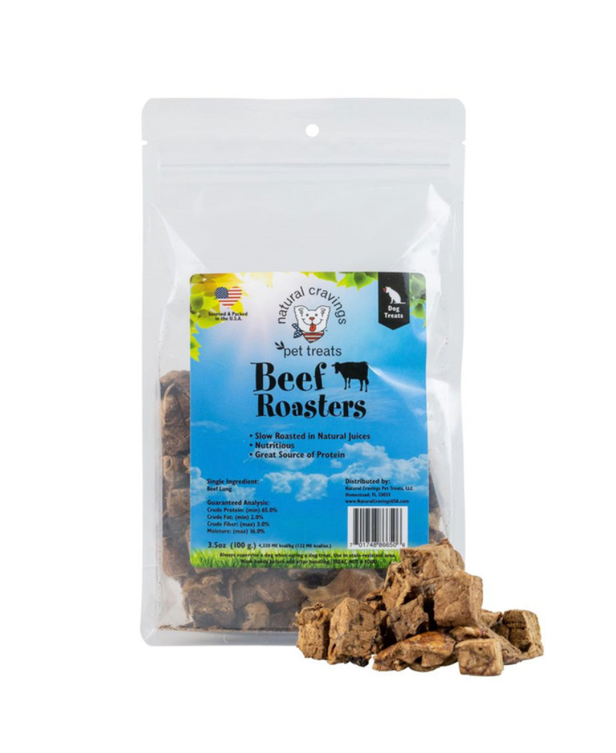 Beef Roasters are a light, easy-to-chew treat made from slow roasted beef lung. These treats are naturally high in protein and low in fat.