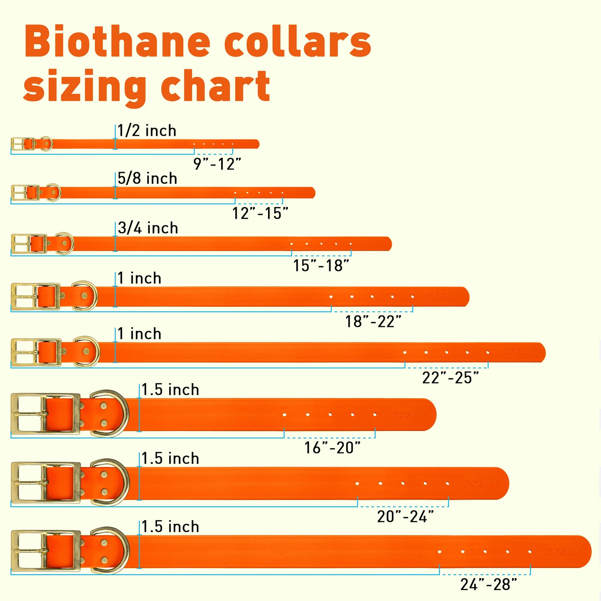 Dogline insists on the highest-quality craftsmanship for our Biothane Collars. We offer them in widths of 1/2", 5/8", 3/4", 1" and 1.5". Available lengths are 9"-12"; 12"-15"; 15"-18"; 18"-22" and 22"-25"; 16"-20", 20"-24" and 24"-28". This array of sizes and widths, plus 26 stylish colors to select from, ensure that we have small, medium, large and giant Collars to deck-out all of your faithful companions.
