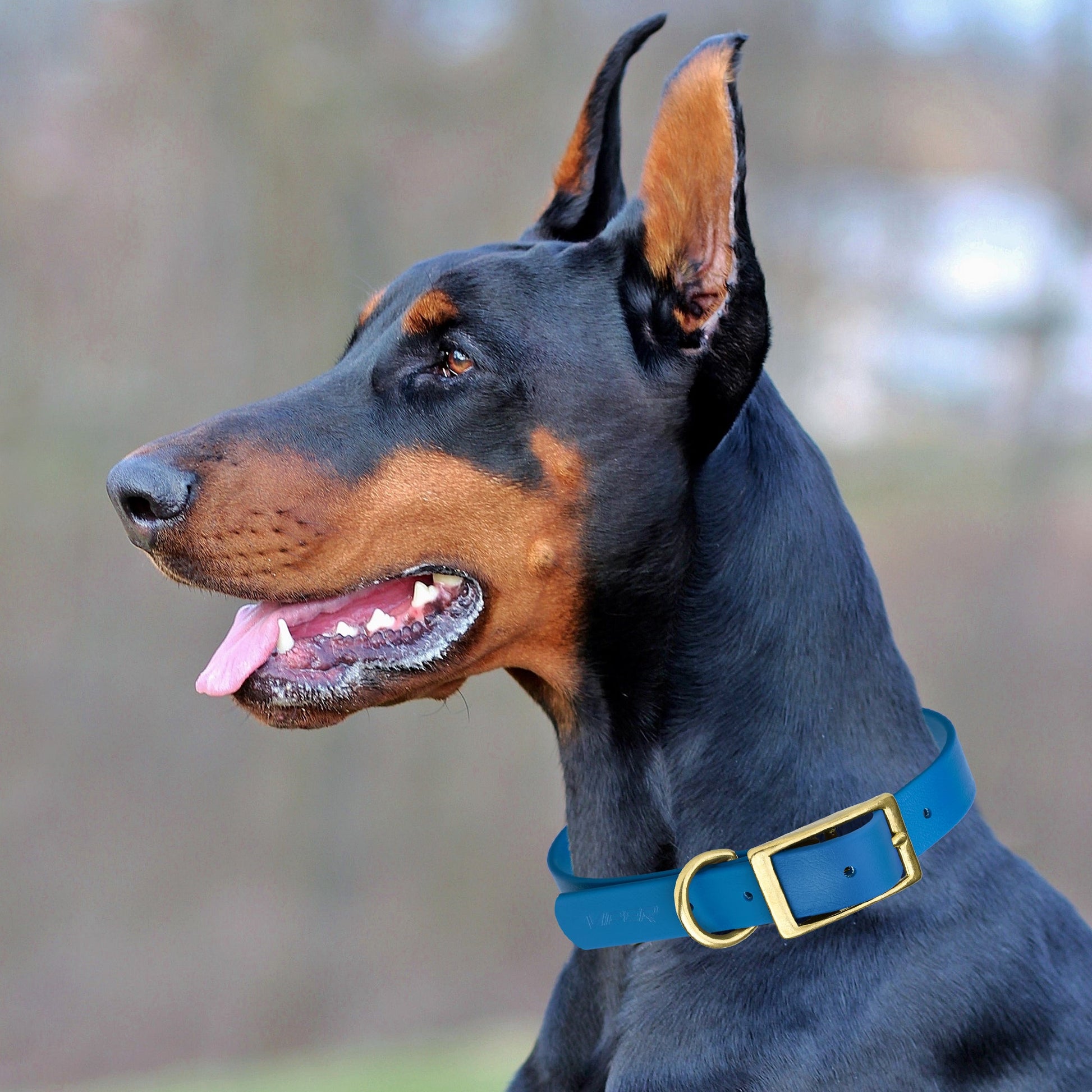A waterproof coating enhances the polyester webbing substrate of our waterproof dog collar, creating a 500-lb break strength per quarter-inch of width. Even if your big dog strains at his leash during walks, this robust collar won't break under normal use. Complete with Solid Brass Hardware, it's the collar of choice for working canines of law enforcement and military units. A metal D-ring makes our collars compatible with our Biothane leashes.