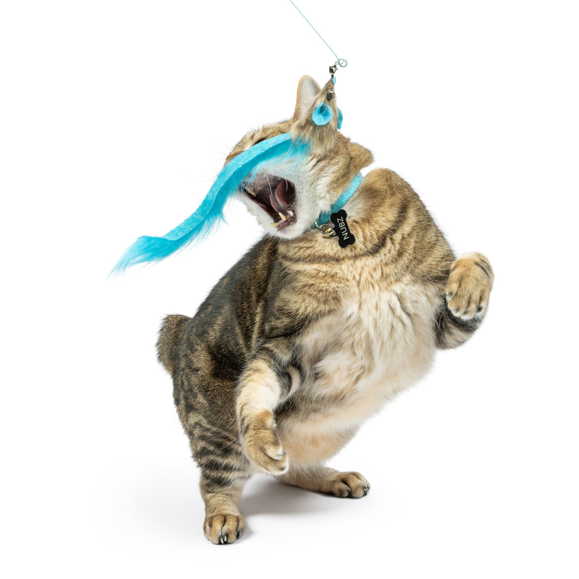After playtime, store wands and teasers out of reach to prevent kitty from chewing on wires, streams, and small metal parts.