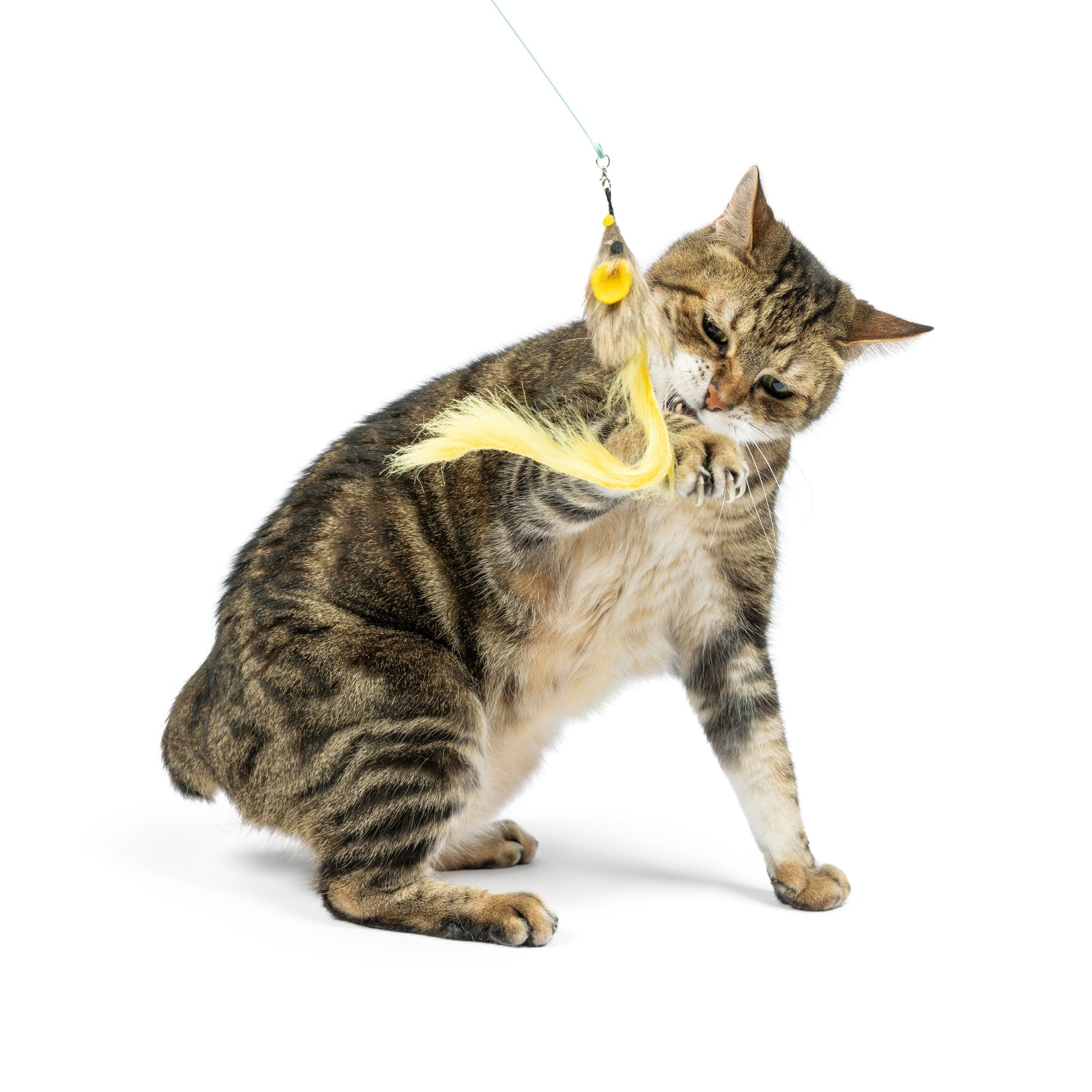 After playtime, store wands and teasers out of reach to prevent kitty from chewing on wires, streams, and small metal parts.
