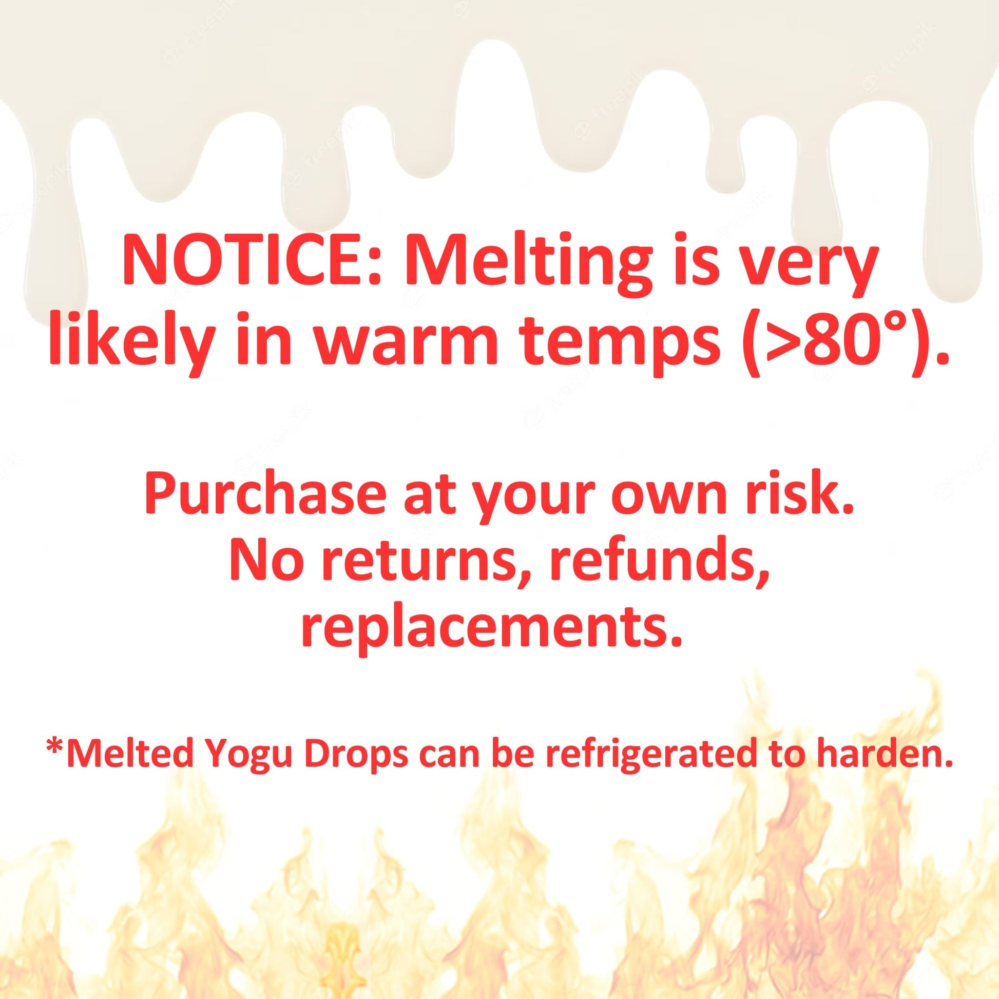 NOTICE: Melting is very likely in warm temps (>80 degrees). Purchase at your own risk. No returns, refunds, or replacements. Add a Cold Pack and choose FedEx Express shipping at checkout for best arrival. Melted Yogu Drops can be refrigerated to harden.